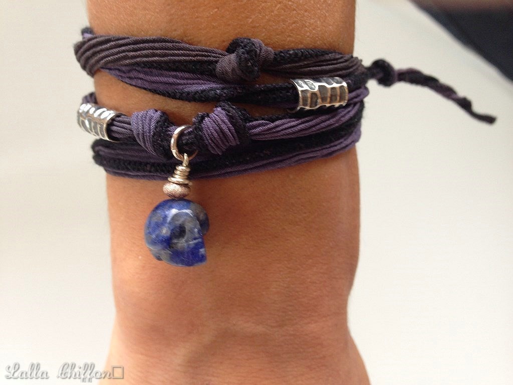 A Ribbon of silk adorned with a skull carved in a semi precious stone. Two cylindrical beads in silver 98% (or a cylindrical bead and a matching charm) end to decorate.